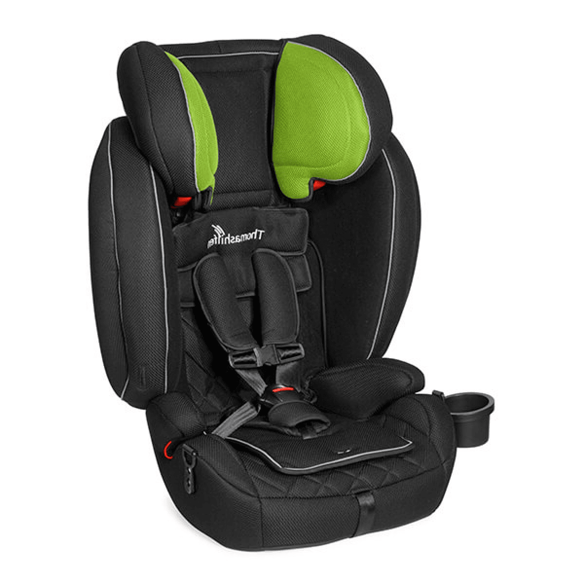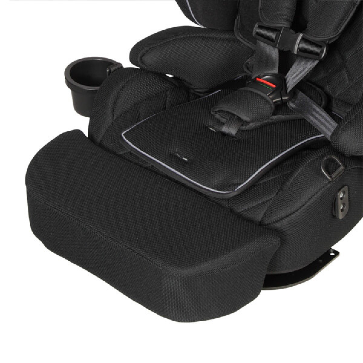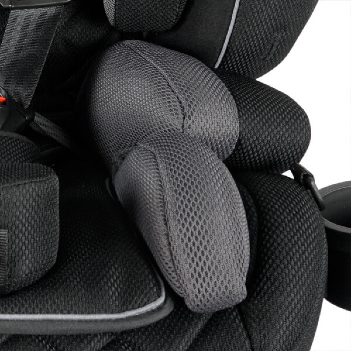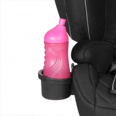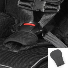 Боковые поддержки и спинка кресла имеют прочные застёжки на основе "велькро", что обеспечивает простоту и гибкость в регулировке. Мягкий подголовник, который можно поднимать или опускать с помощью рычага на спинке, также добавляет дополнительный комфорт. Плечевые ремни оснащены мягкими накладками и их длина регулируется в зависимости от роста пользователя, что обеспечивает надёжную фиксацию и безопасность во время поездки. Кроме того, подстаканник можно установить как с левой, так и с правой стороны, что делает использование кресла еще более удобным.