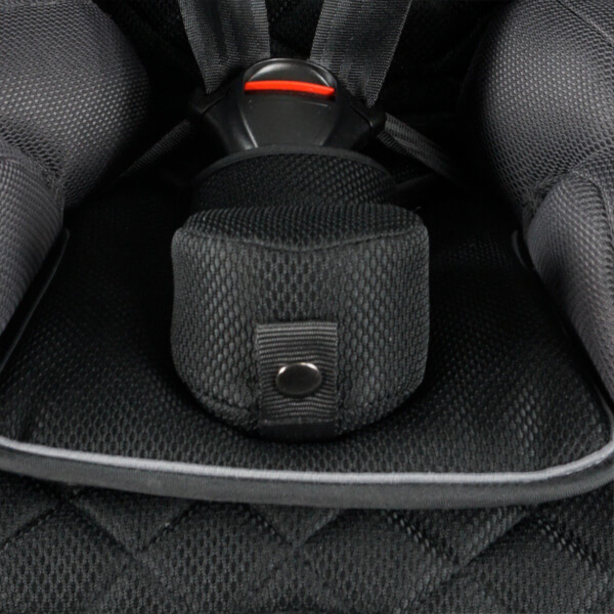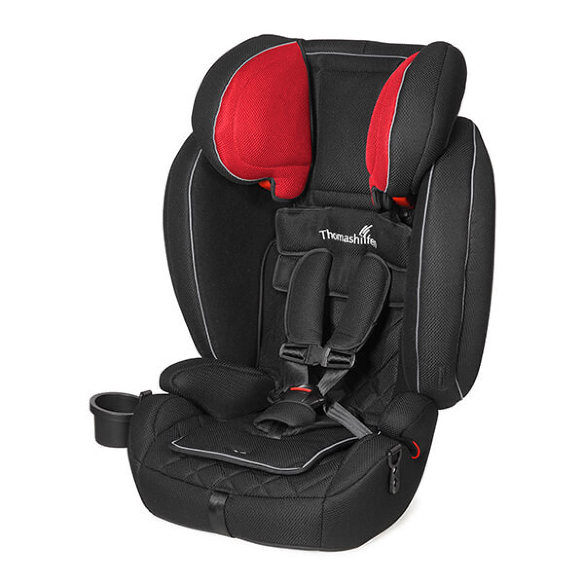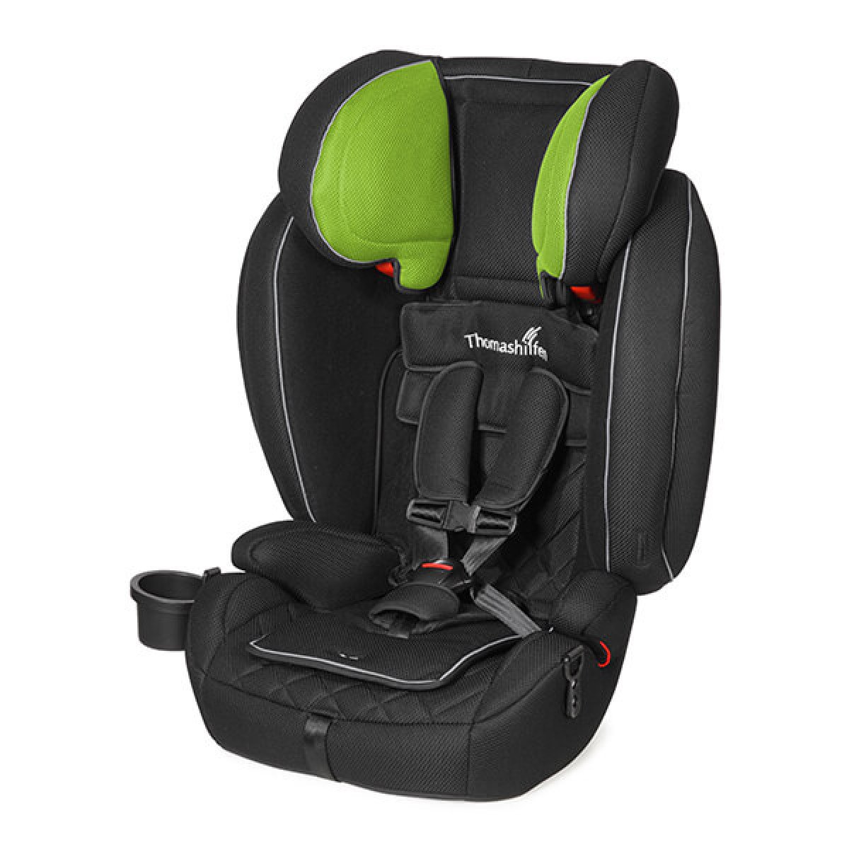 Боковые поддержки и спинка кресла имеют прочные застёжки на основе "велькро", что обеспечивает простоту и гибкость в регулировке. Мягкий подголовник, который можно поднимать или опускать с помощью рычага на спинке, также добавляет дополнительный комфорт. Плечевые ремни оснащены мягкими накладками и их длина регулируется в зависимости от роста пользователя, что обеспечивает надёжную фиксацию и безопасность во время поездки. Кроме того, подстаканник можно установить как с левой, так и с правой стороны, что делает использование кресла еще более удобным.