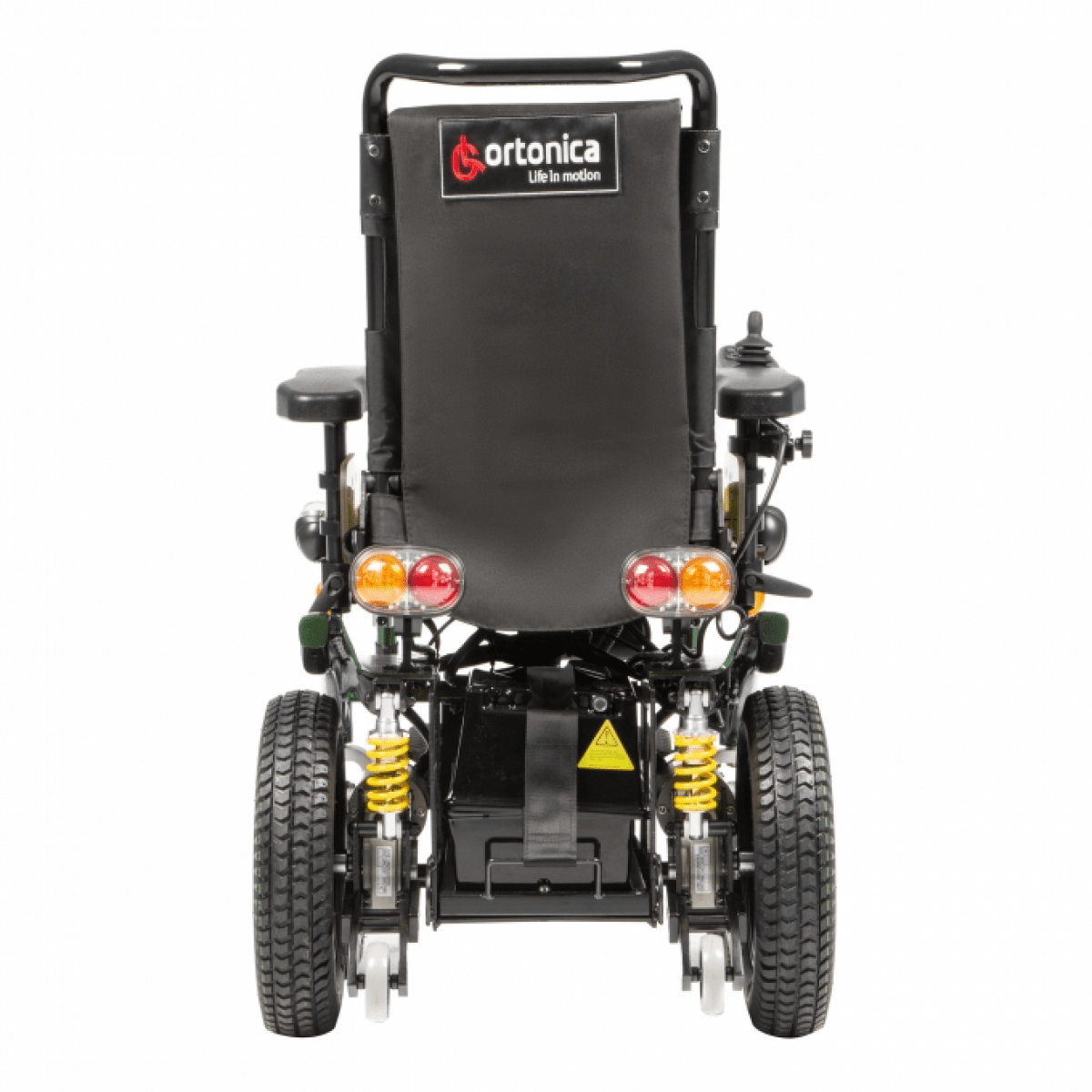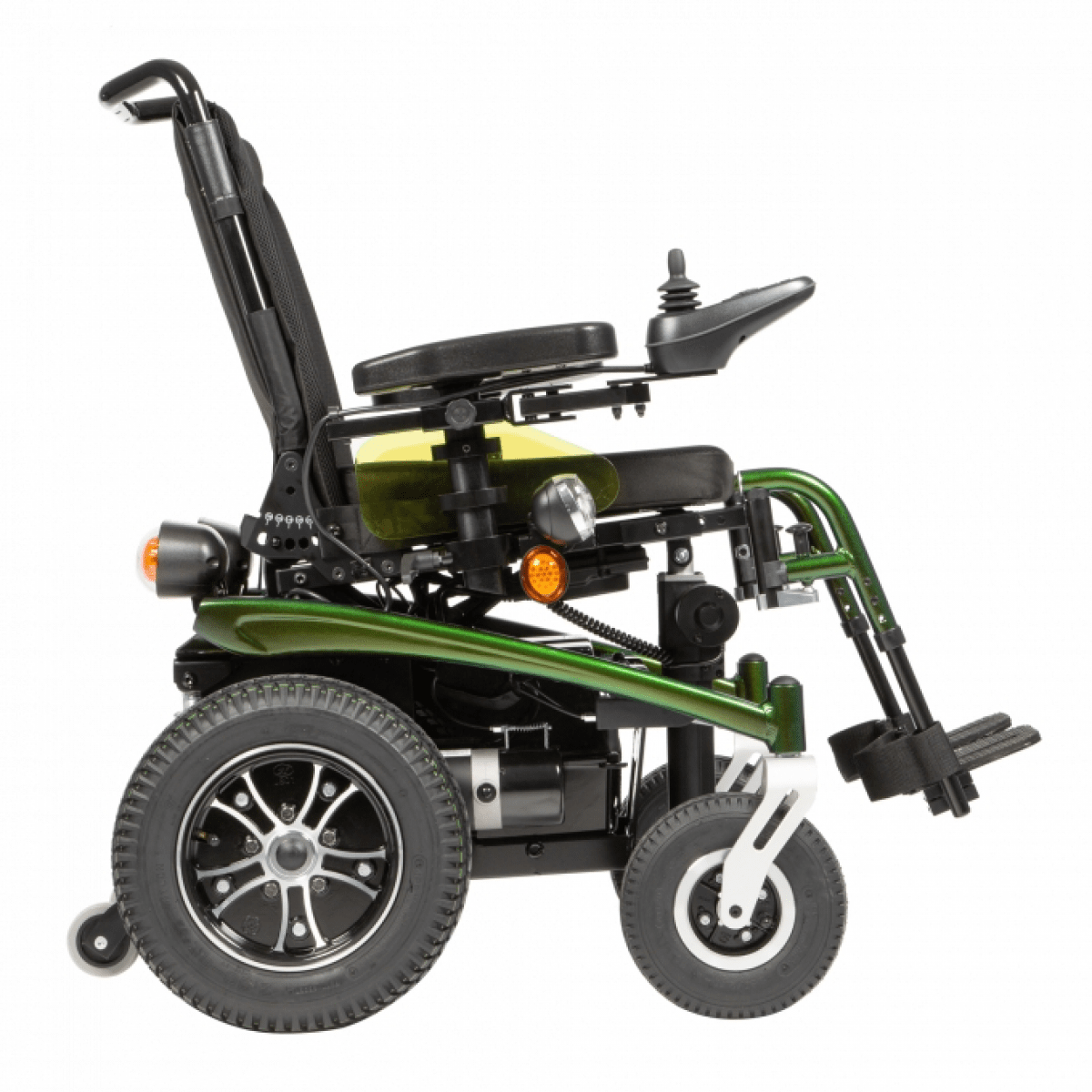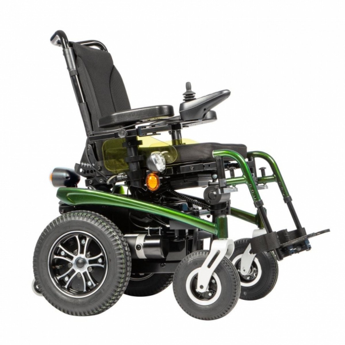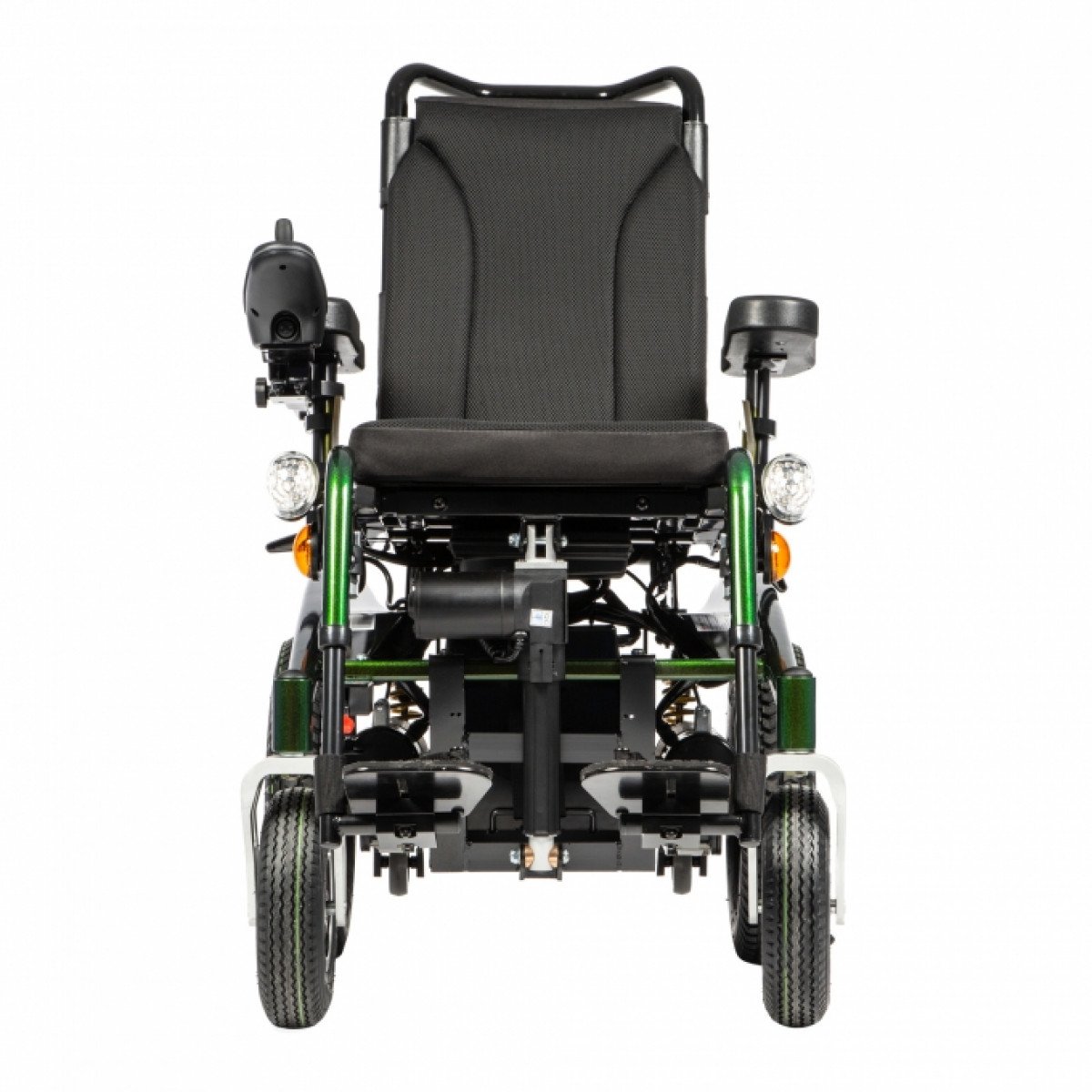 Коляска имеет два привода мощностью 450 Вт с редукторами и электромагнитным тормозом. Электромагнитный тормоз предотвращает откат коляски с наклонных поверхностей. Одного заряда аккумуляторов хватит на 30 км движения без подзарядки со скоростью до 7 км/ч.