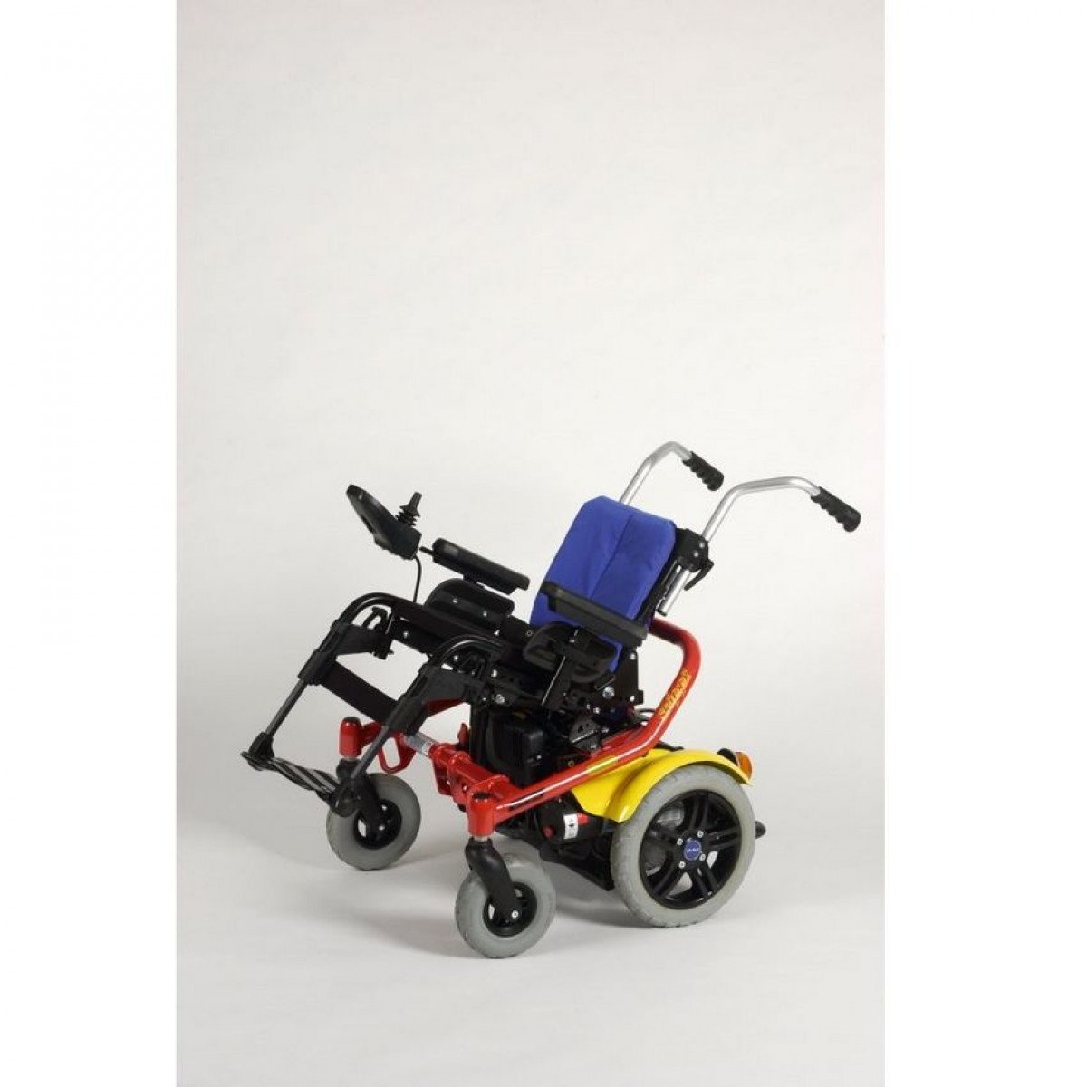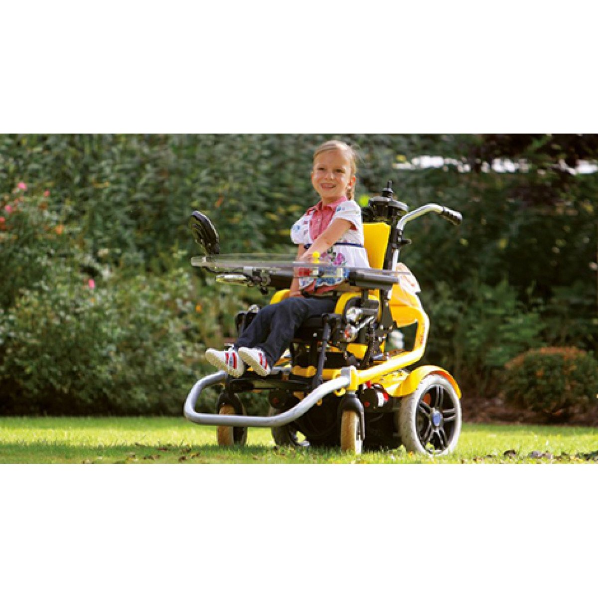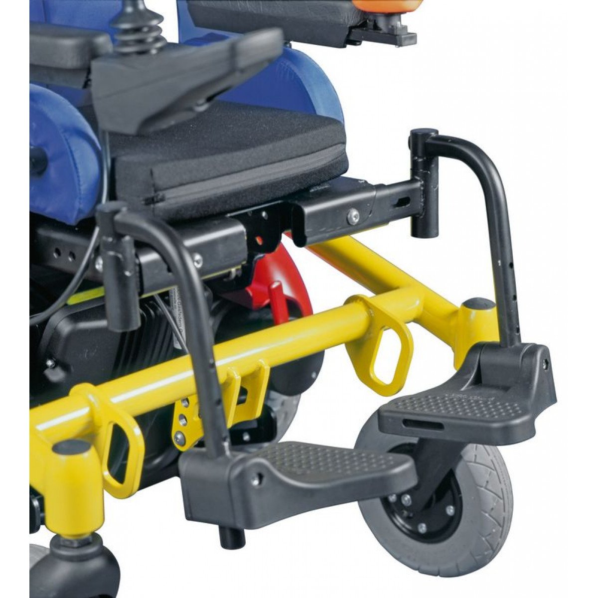 Коляска имеет в своём оснащении легкосъёмные подлокотники и подножки для удобного подъезда к мебели и пересаживания. Также их легко настроить по высоте. Глубина и ширина сиденья, а также подножки регулируются под индивидуальные нужны ребёнка. На подлокотнике установлен многопозиционный джойстик для самостоятельного управления коляской. Его положение можно регулировать по горизонтали и высоте, устанавливать слева или справа. Аккумулятора хватит на 30 км движения без подзарядки.