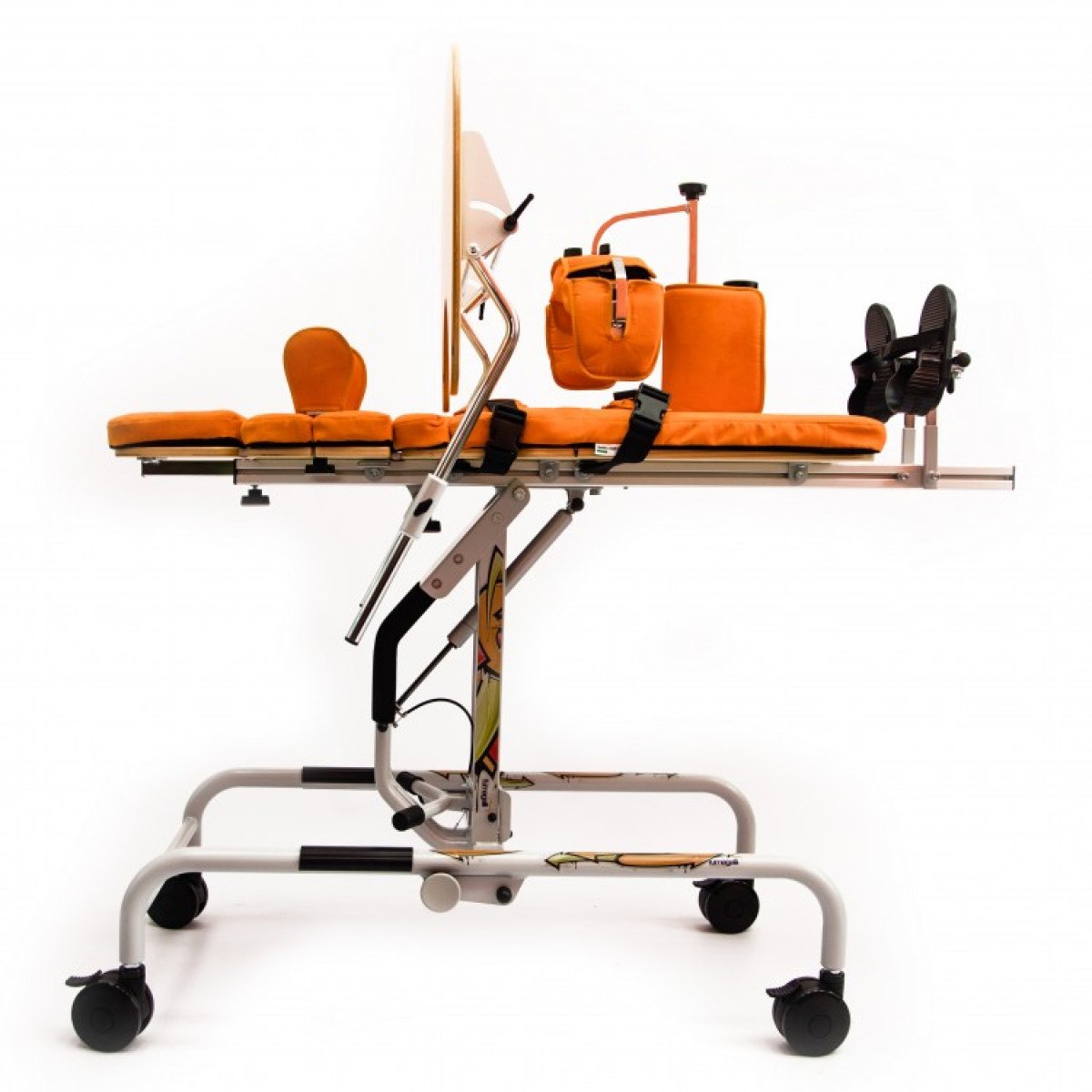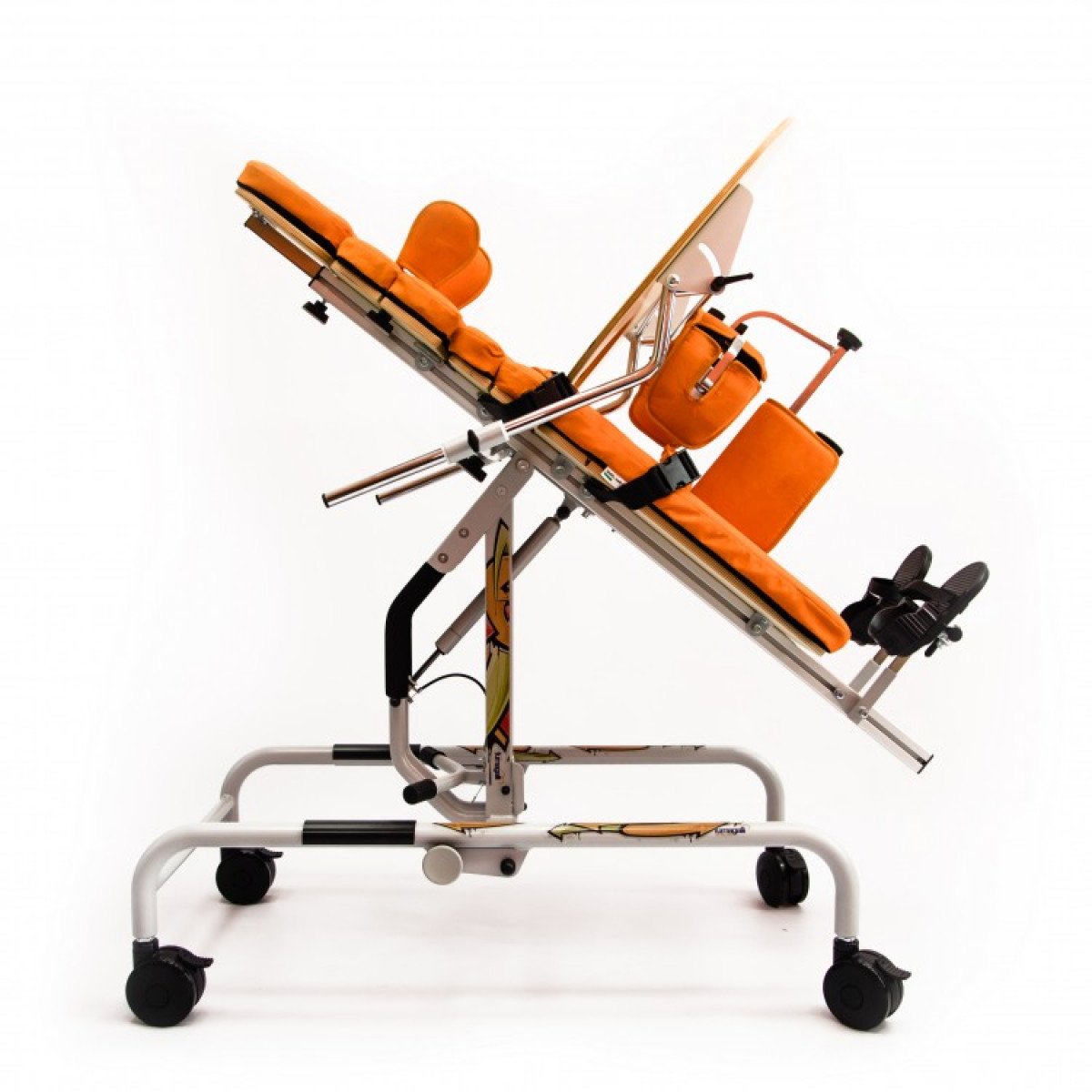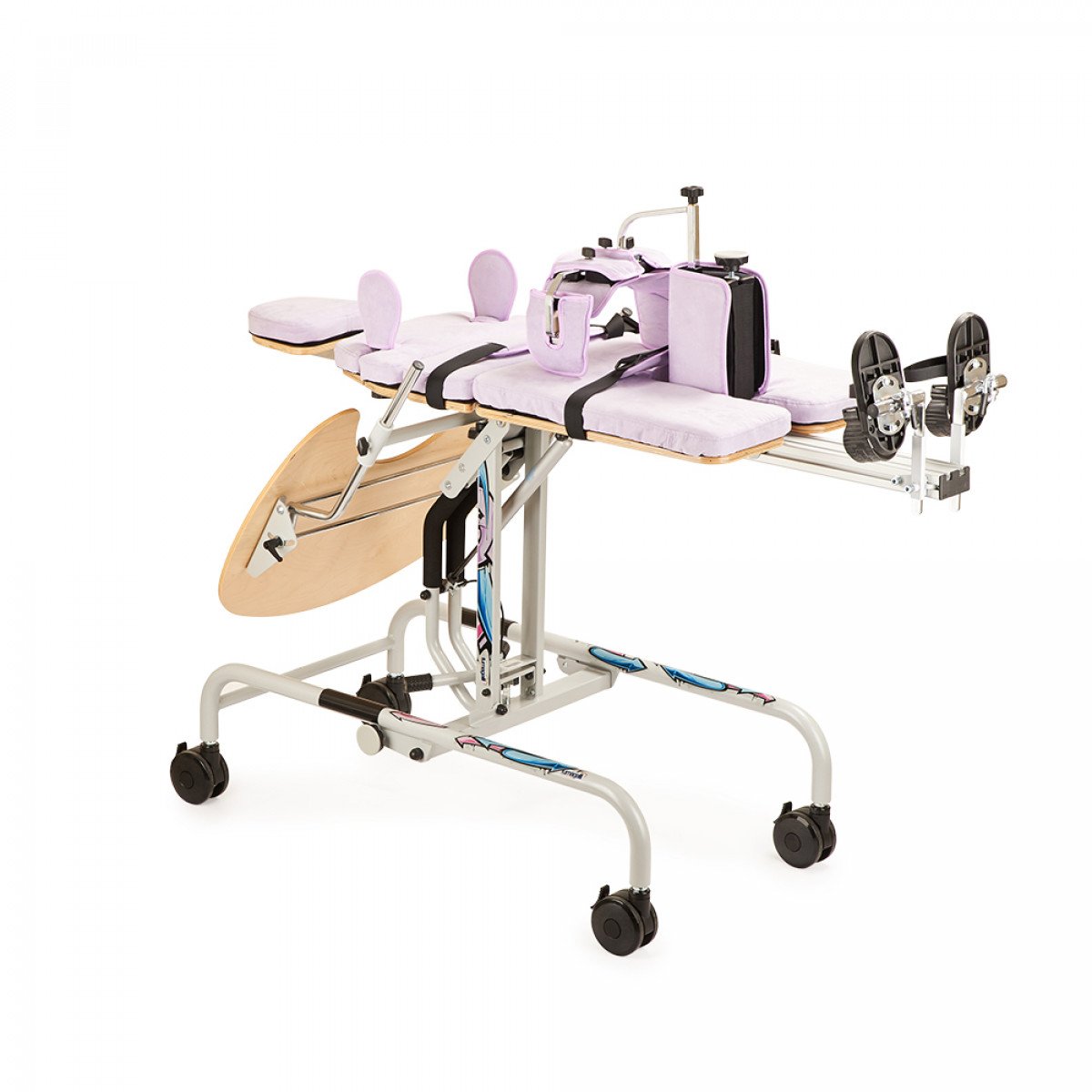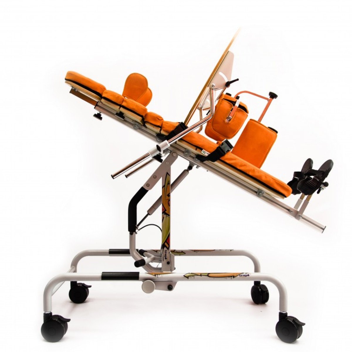 Рама занимает минимум места даже во время использования, что повышает удобство проведения реабилитационных упражнений и обеспечивает рациональное хранение. Надежная фиксация обеспечивается благодаря наличию фиксирующих ремней для туловища, таза, коленей с мягкой комфортной обивкой, которые не доставляют дискомфорта. Уникальная многоуровневая регулировка наклона из полностью горизонтального положения в вертикальное.