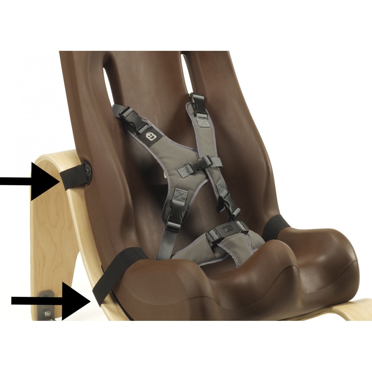 - Оснащен крепёжным ремнём (ремень для крепления кресла к стулу или к коляске)