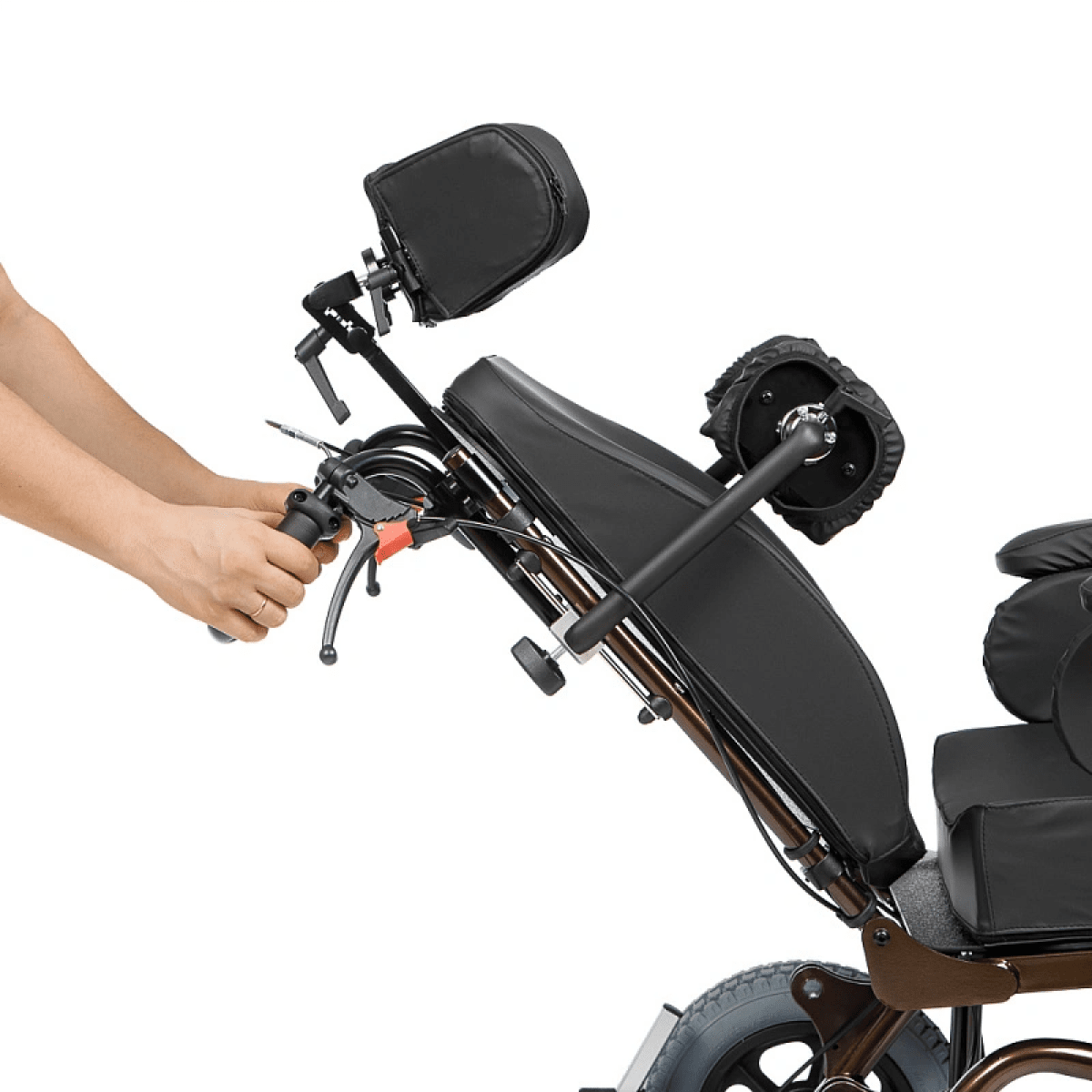 Коляска имеет настраиваемую по углу наклона спинку: её можно установить под углом от 90° до 130°. Для этого достаточно нажать на левый рычаг. При помощи правого рычага настраивается наклон спинки вместе с сиденьем. Сиденье кресла регулируется по глубине для максимальной подстройки под пользователя.