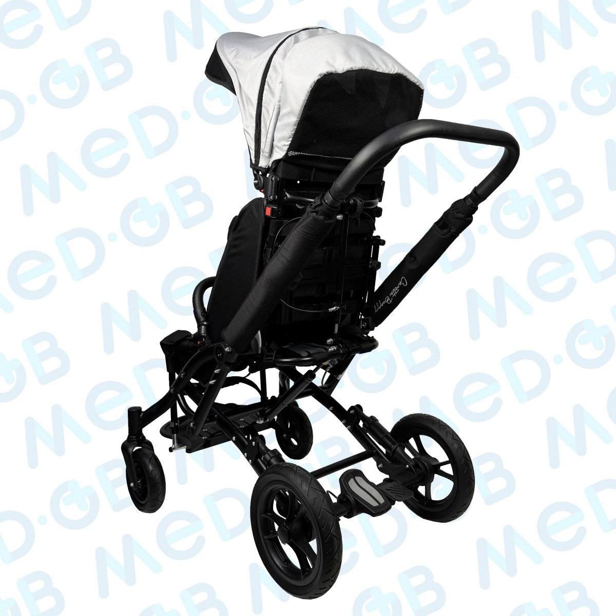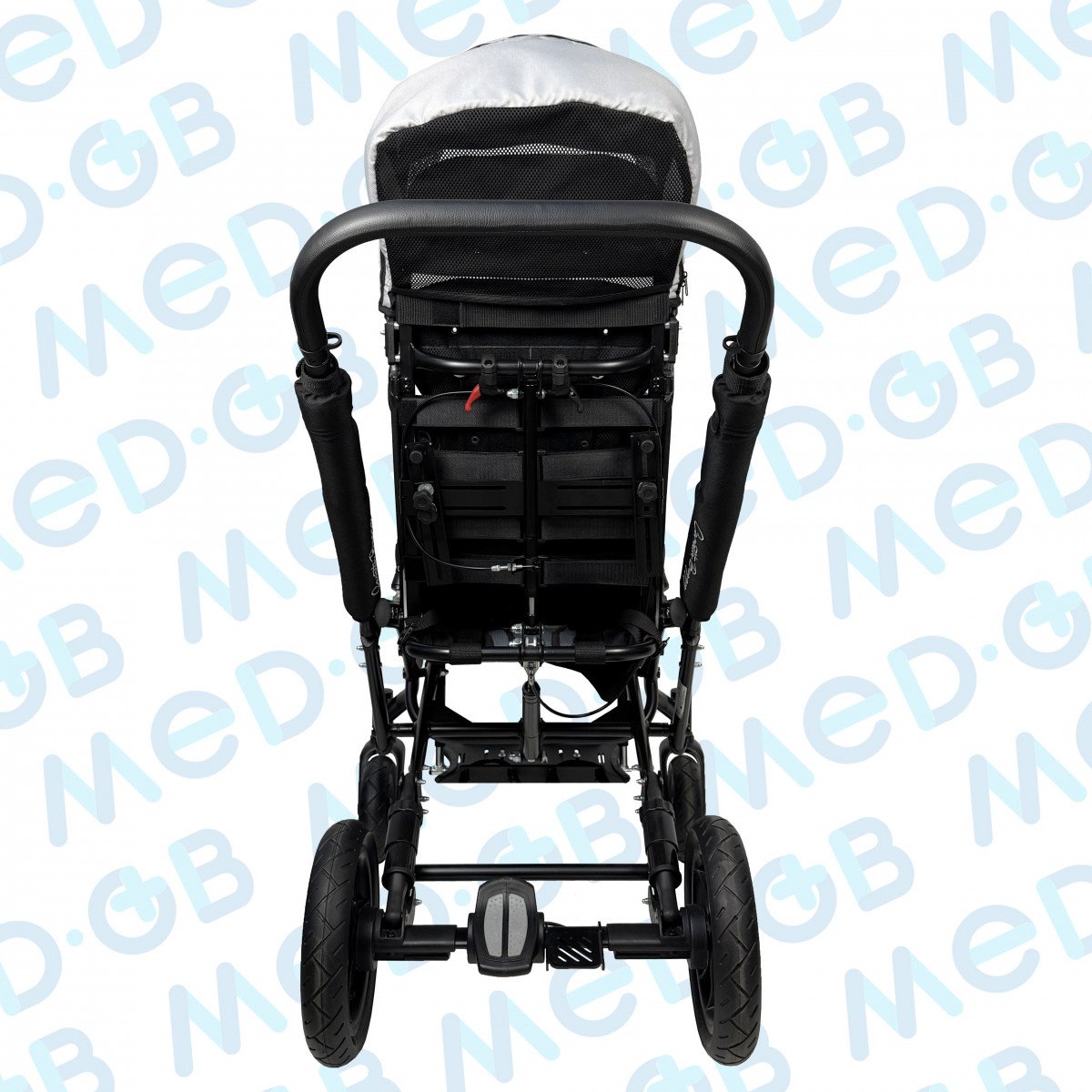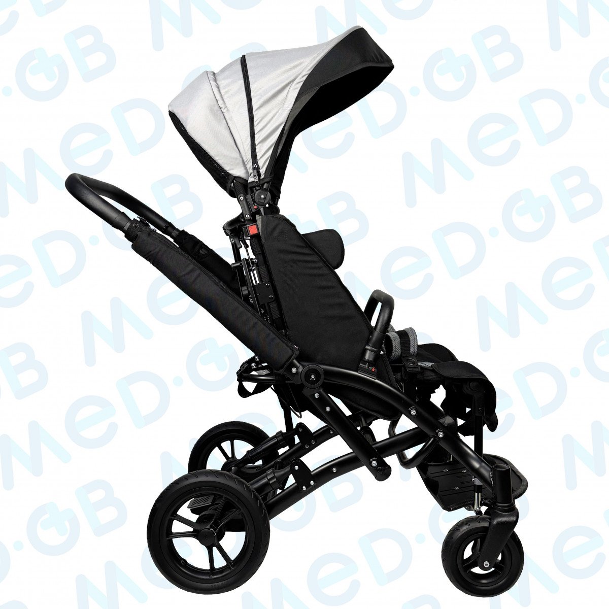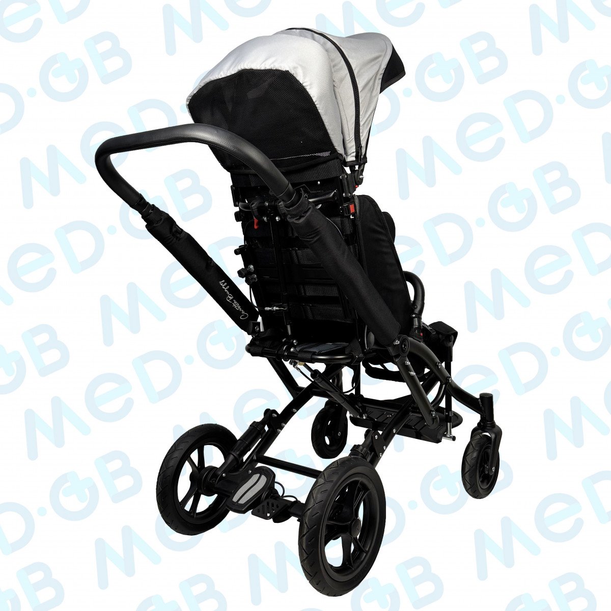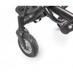 Благодаря специальной конструкции сиденья, состоящего из эластичных лент, можно регулировать жесткость. Сиденье и спинка имеют широкий диапазон регулировок по углу наклона. Рама коляски складная. Для удобной транспортировки коляски в автомобиле задние и передние колёса быстросъёмные. Для плавности хода подвеска задних колёс оснащена амортизаторами.