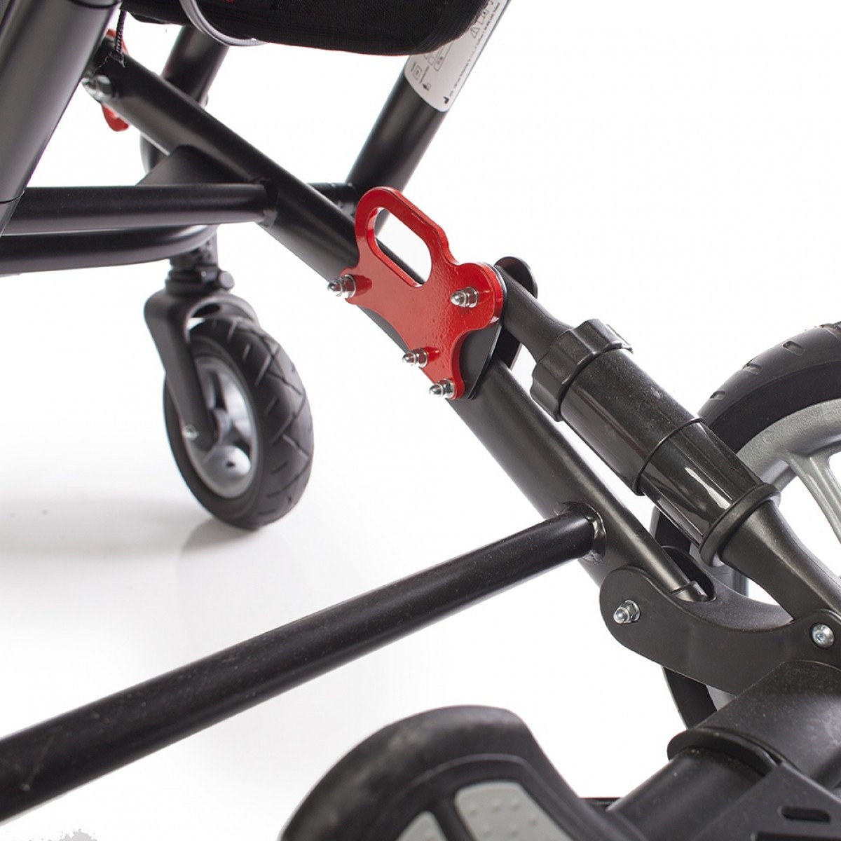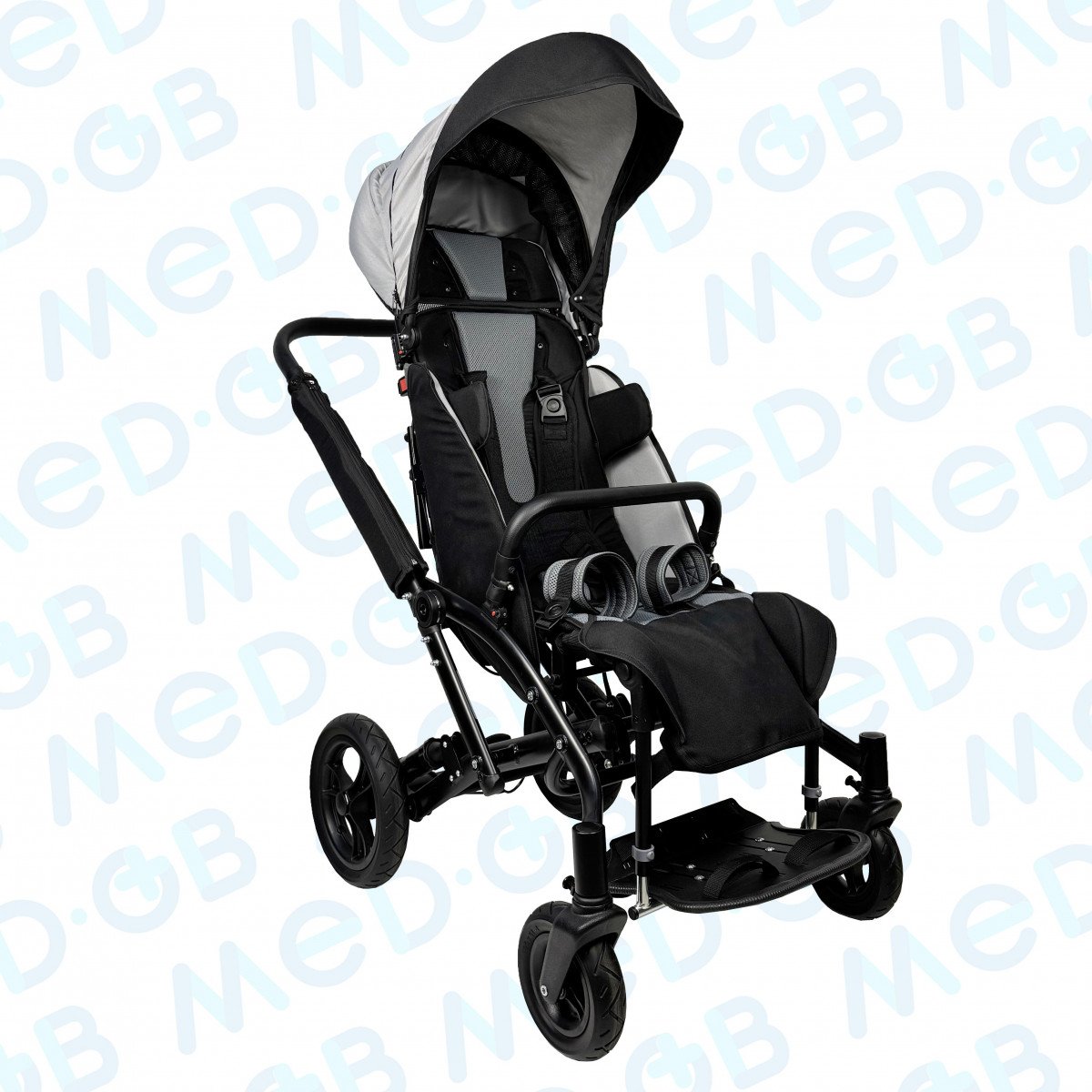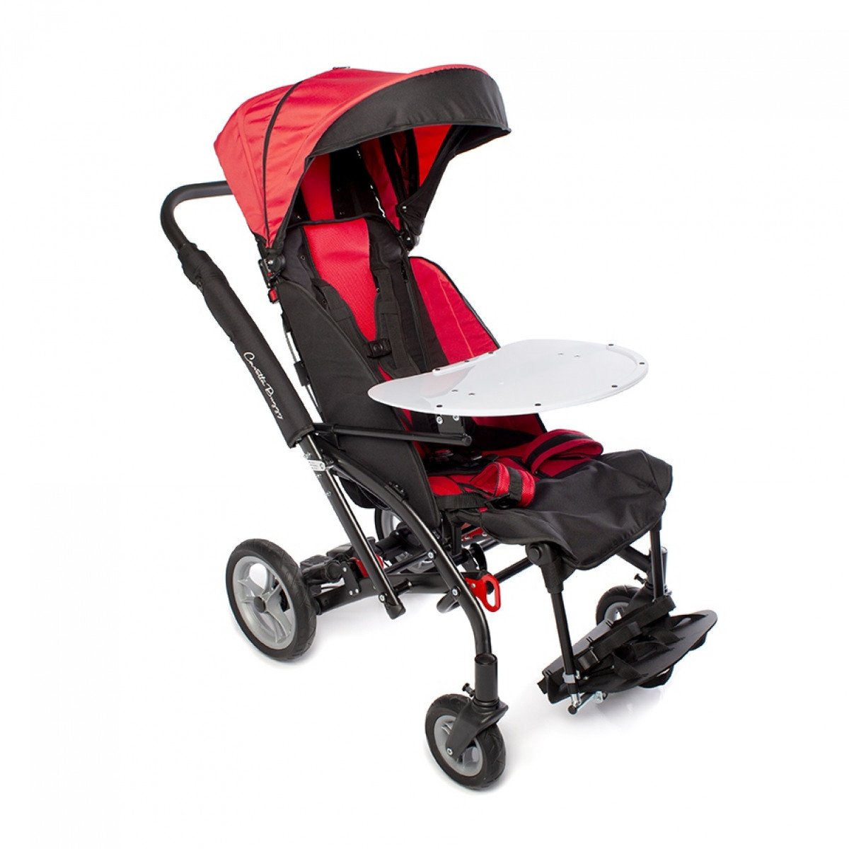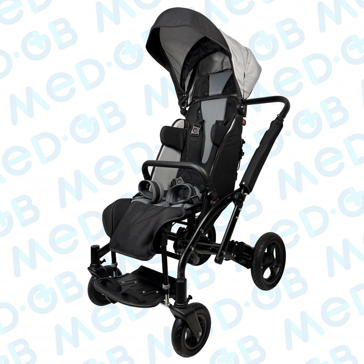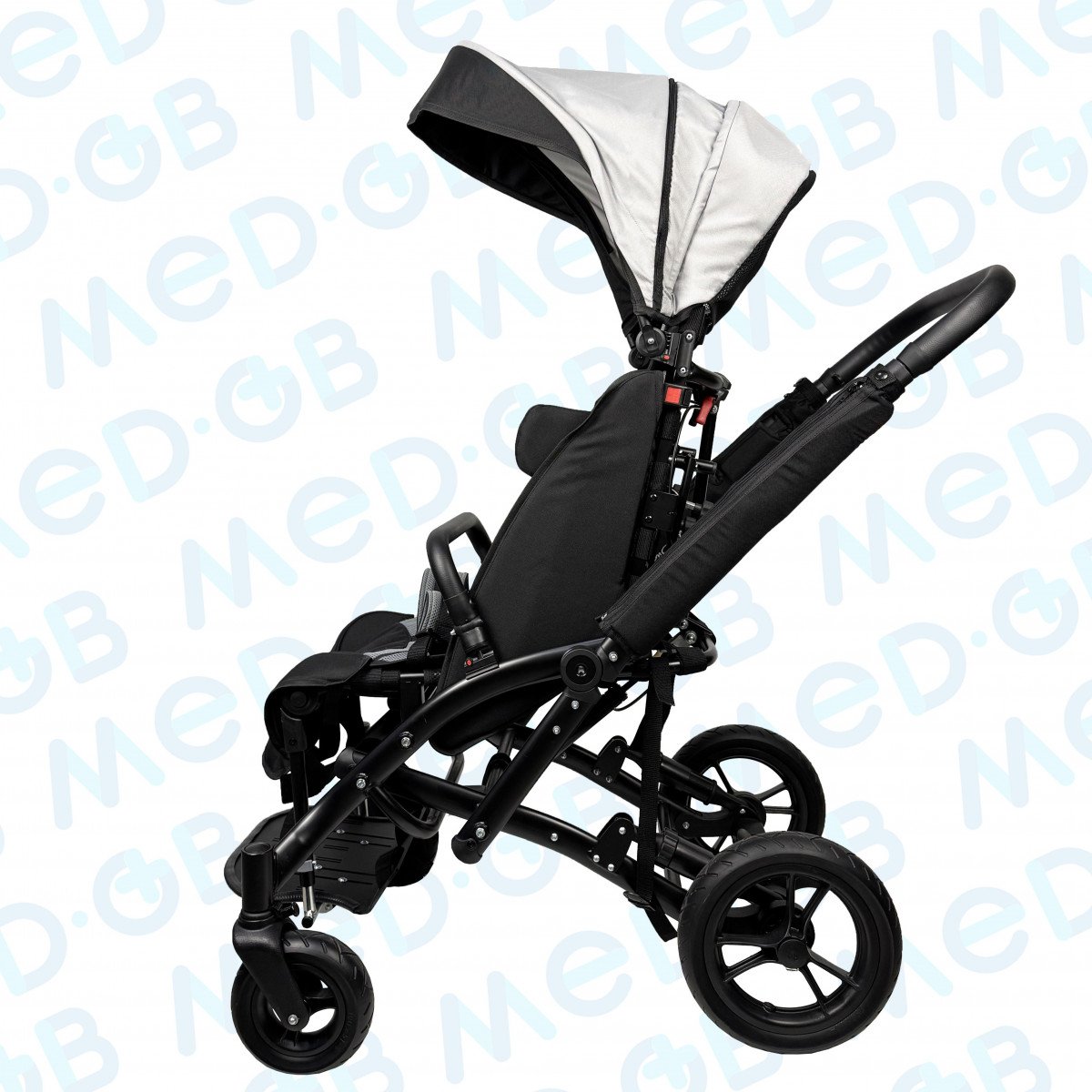 Благодаря специальной конструкции сиденья, состоящего из эластичных лент, можно регулировать жесткость. Сиденье и спинка имеют широкий диапазон регулировок по углу наклона. Рама коляски складная. Для удобной транспортировки коляски в автомобиле задние и передние колёса быстросъёмные. Для плавности хода подвеска задних колёс оснащена амортизаторами.