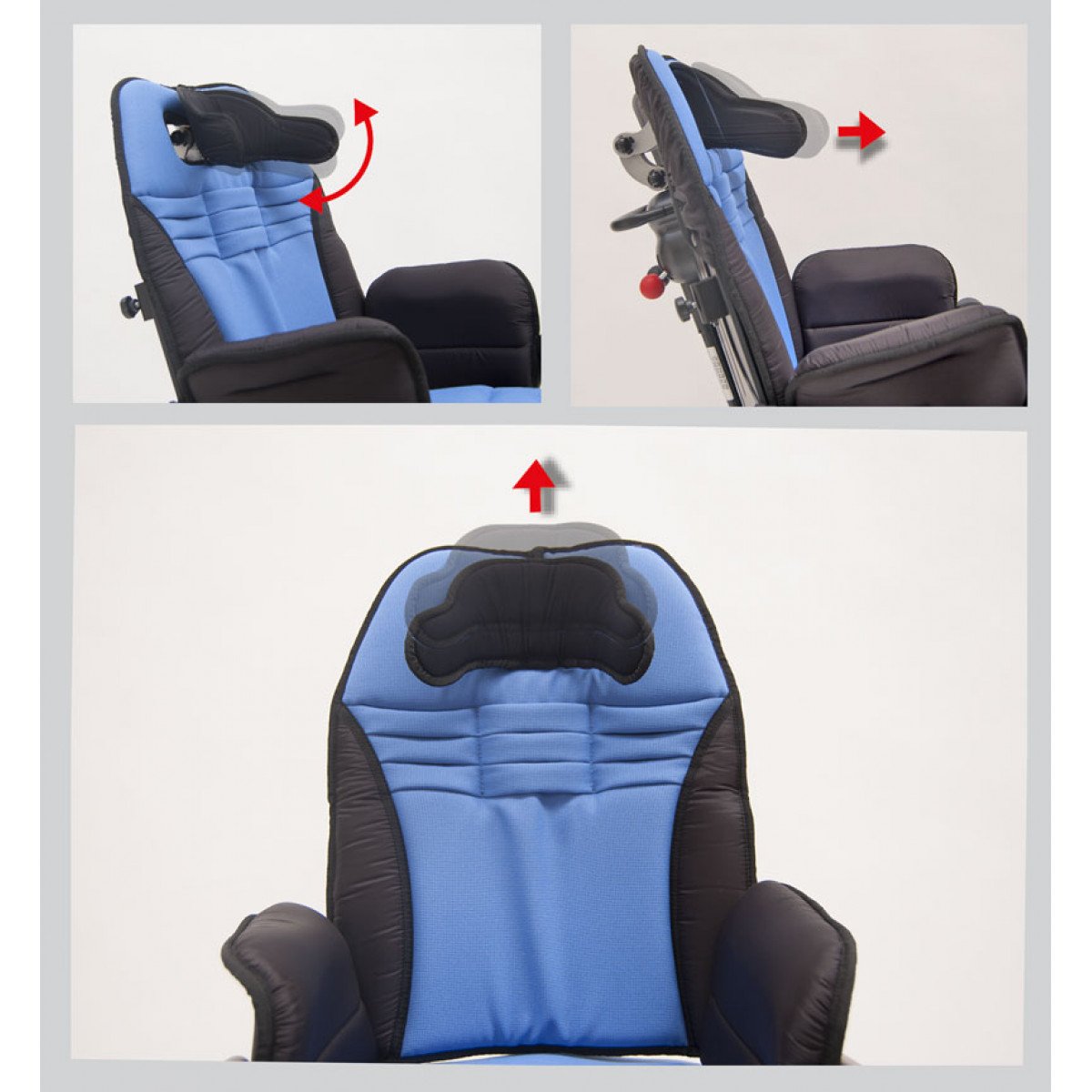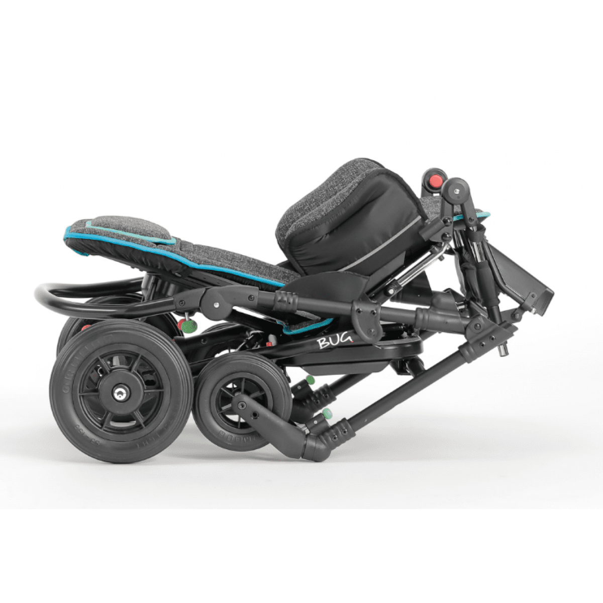 Петли регулировки сиденья расположены близко к суставам пользователя (тазобедренным, коленным и голеностопным суставам). Эта структурная особенность является основным фактором, способствующим хорошему самочувствию ребёнка, так как осанка не изменяется во время регулировки наклона. Угол наклона спинки и сиденья регулируются двумя независимыми газовыми пружинами; эта функция делает регулировки особенно мягкими и плавными. При полном наклоне кресло принимает почти лежачее положение. Выпускается в двух размерах: малый и большой. Малый размер S подходит для пользователей ростом 90-120 см и весом 35 кг, большой размер L подходит для пользователей ростом 115-140 см и весом 45 кг. Подголовник встроен в спинку, поэтому голова ребёнка постоянно поддерживается во время регулировок сиденья и спинки. Жесткая спинка коляски BUG размером 1-2 имеет угол наклона до 35° и регулируется в высоту до 10 см, соответствует физиологическому изгибу тела. Жесткая спинка с наклоном до 40° регулируется в в высоту до 10 см (размеры 1-2) и до 15 см (размеры 3-4) соответствует физиологическому изгибу тела. Откидная подножка, регулировка сгибания-разгибания, регулируемая опора для ног по высоте и углу, соответствует физиологическому изгибу коленей.