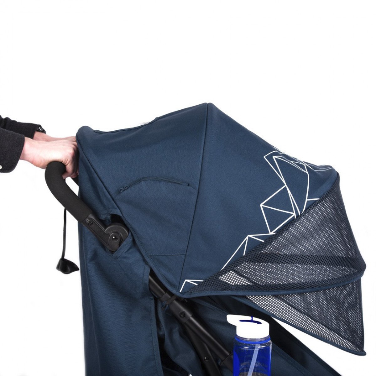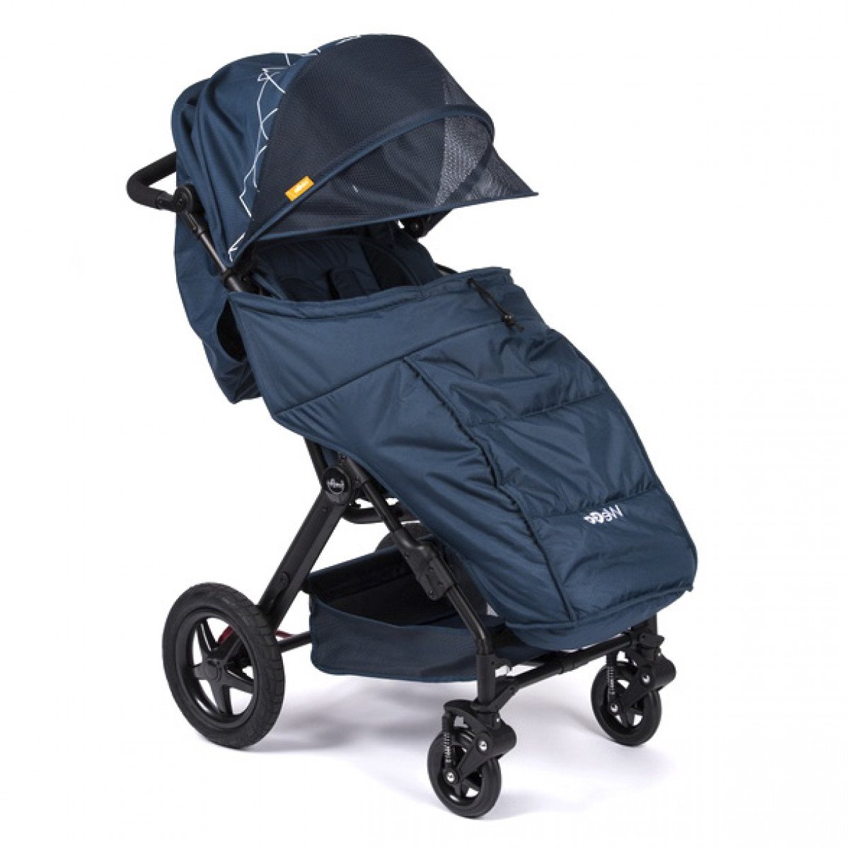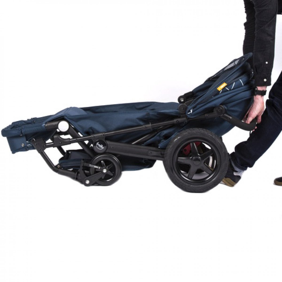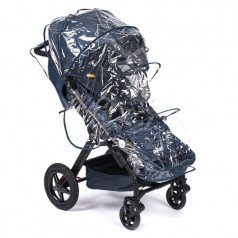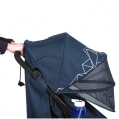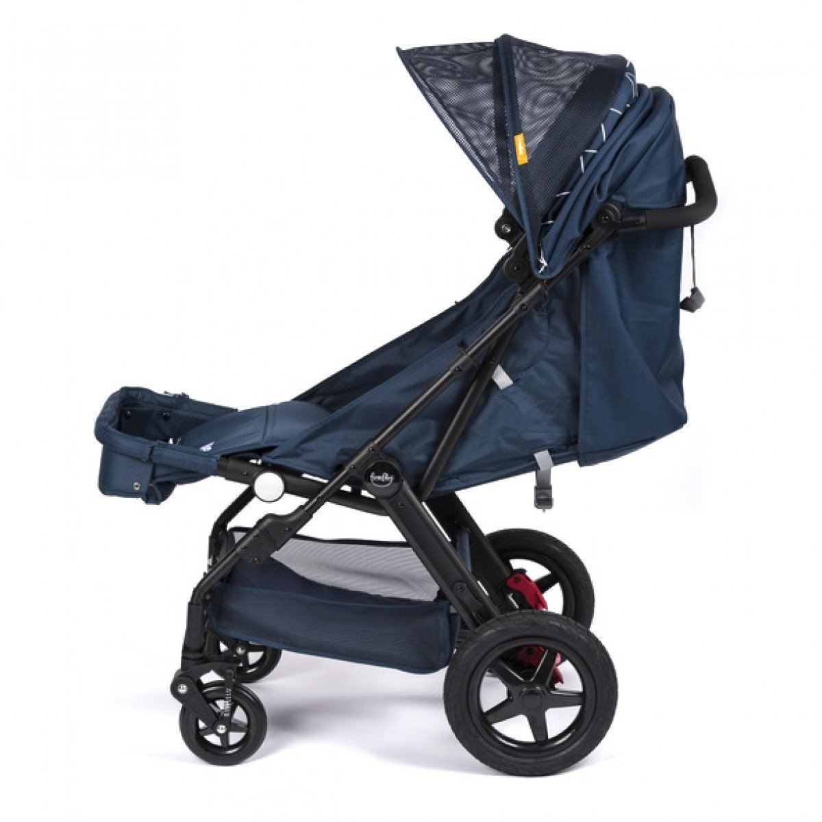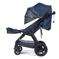 Колёса коляски, как передние, так и задние, быстросъёмные, что делает транспортировку и хранение коляски более удобными. Коляска выполнена в синих сдержанных тонах и оснащена навесом, вместительной корзиной и пятиточечным ремнём для безопасности ребёнка.