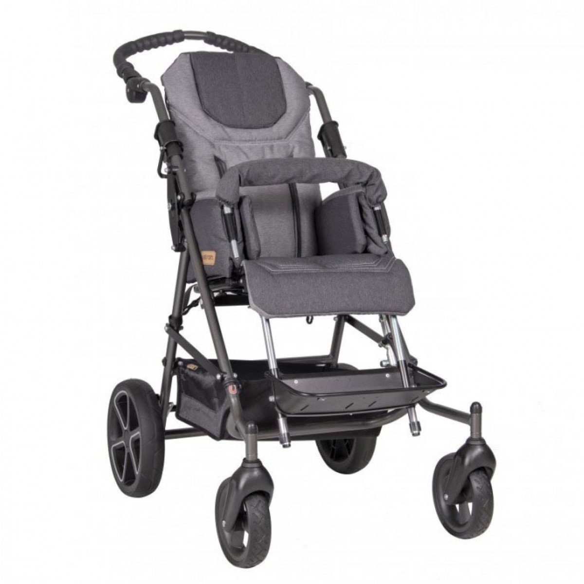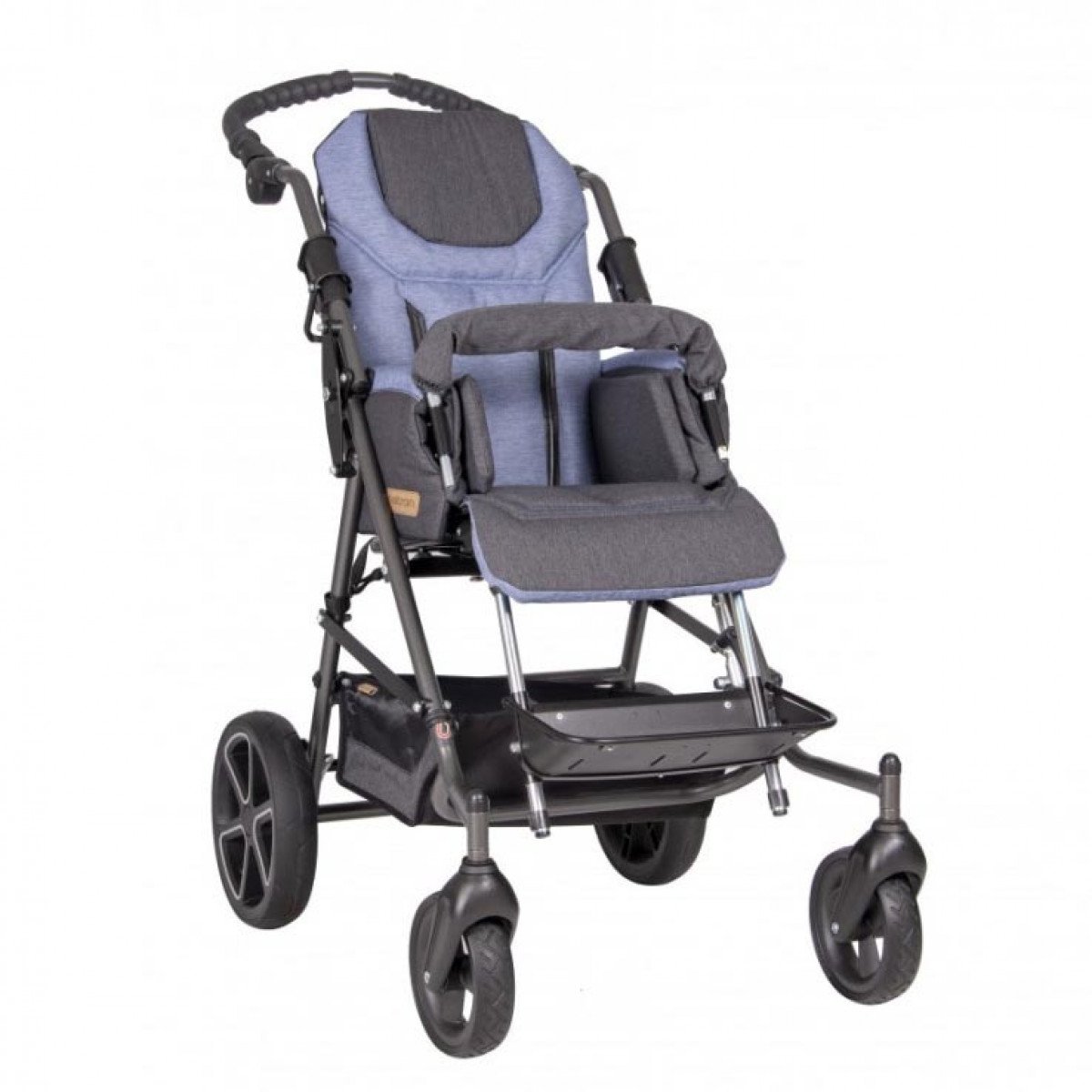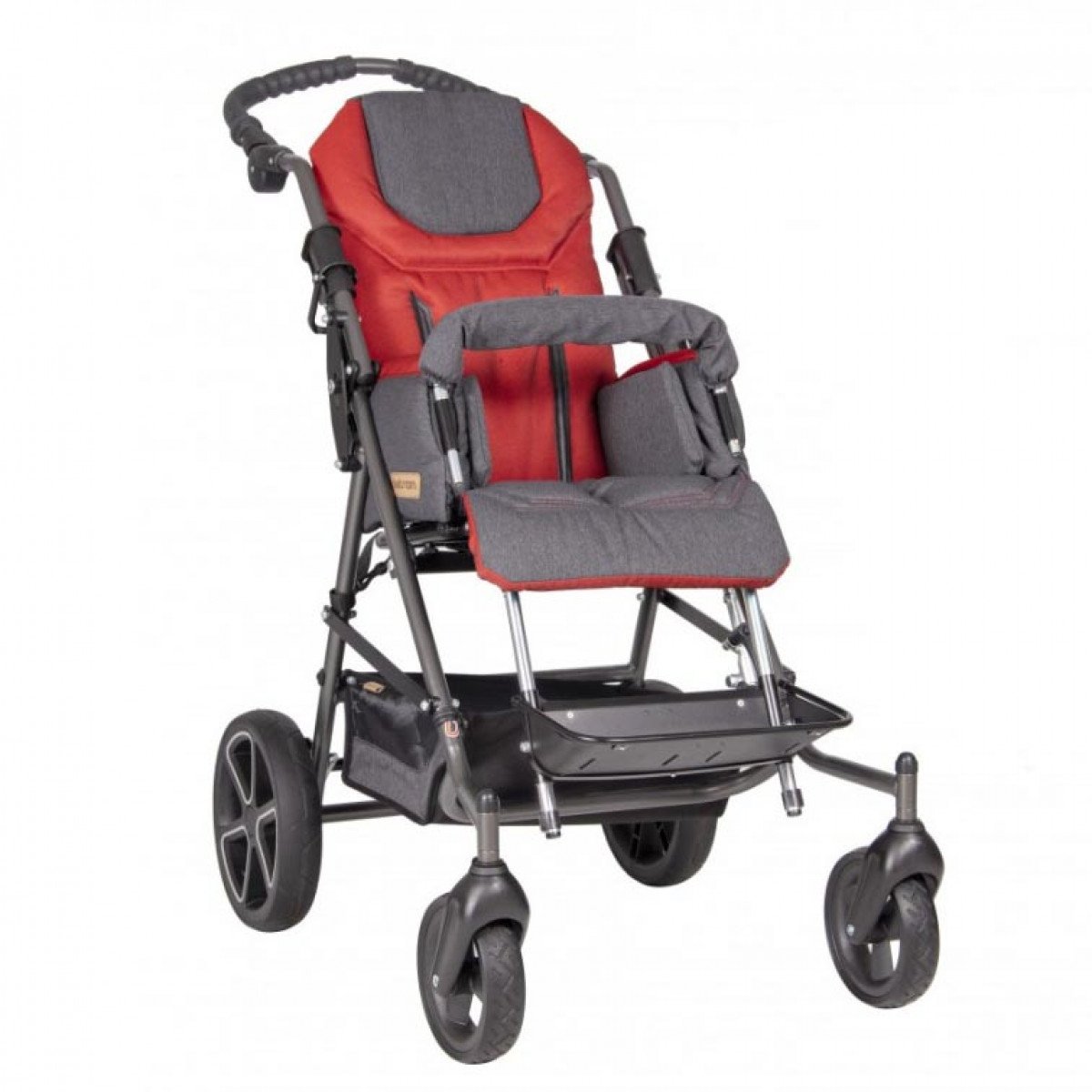 Эргономичная ручка для сопровождающего лица позволяет удобно управлять коляской, минимизируя усилия при её движении. Дизайн рамы дополнен литыми колёсами, которые обеспечивают отличную проходимость и манёвренность. Для повышения универсальности коляски, при необходимости, можно дополнительно установить пневматические колёса, которые обеспечивают большую амортизацию и комфорт при передвижении.