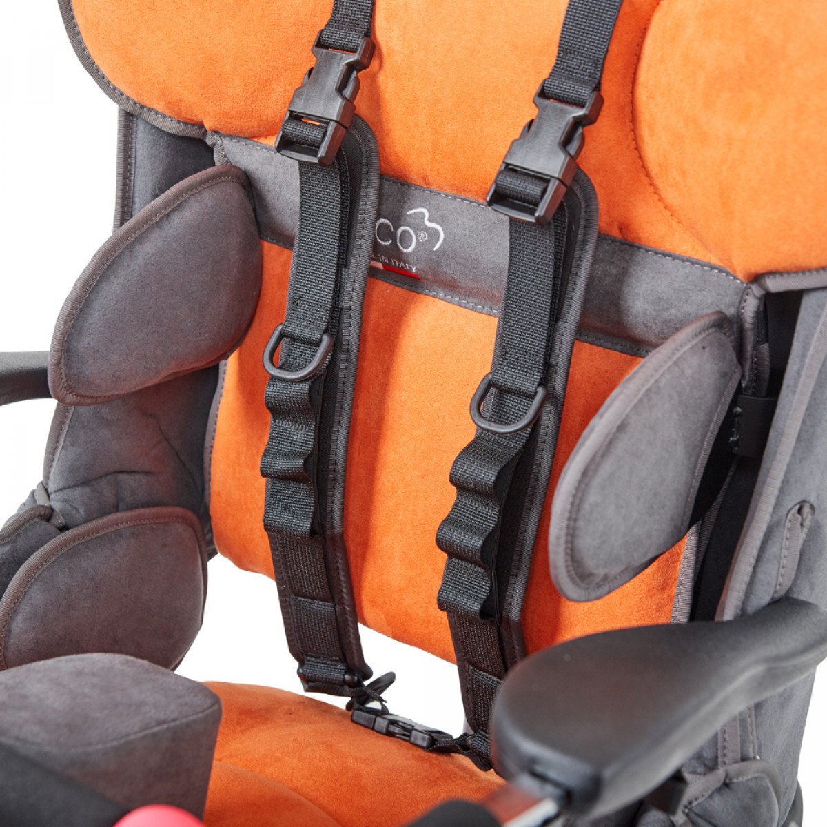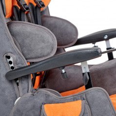 В базовой комплектации коляска устанавливается на прогулочную раму Fuori New,которая отлично подходит для использования как в помещении, так и на улице. Она легко проходит в дверные проёмы, не занимает много места. Удобное сиденье легко снимается и может быть установлено на различные опорные рамы: Fuori, High Low, Dentro. В зависимости от особенностей малыша вы можете легко настраивать глубину сиденья, высоту и угол наклона спинки. Для надёжной фиксации ребёнка в кресле предусмотрен прочный 5-точечный ремень, а для дополнительной безопасности – мягкий поручень-ограничитель. Кресло обеспечит боковую поддержку и поддержку таза: коляска оснащена боковыми тазовыми поддержками с независимой настройкой. Имеется мягкий регулируемый абдуктор, функциональный подголовник Shapeable регулируется по высоте, глубине и углу наклона. Коляска имеет очень удобные подлокотники с регулировкой по высоте, а также сплошную настраиваемую подножку с держателями стоп и голени.